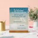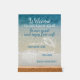 Este moderno y elegante cartel de un acrílico peatonal muestra 'Bienvenido - a nuestra casa de playa - sé nuestro huésped y disfruta de wifi gratis - red: - contraseña: - disfruta de tu estancia' en verde azulado texto azul contra una hermosa playa de arena y el fondo de las olas del océano. Se puede personalizar o personalizar con tu propio mensaje. Es un método sencillo y acogedor para informar a sus huéspedes sobre los detalles de acceso a Internet.