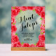 El claro cartel de la mesa de ducha acrílica de novia tiene un borde de rosas rojas y las palabras y las palabras "MINT JULEPS" y sus ingredientes. Más signos y elementos COINCIDENTES en nuestra colección.