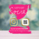 Acrílico obtengamos un signo social con pinceles rosados calientes impresos, tu código QR y un ícono de los medios sociales de oro falso personalizado con tu cuenta de medios sociales. Signo promocional de medios sociales con fuentes blancas y trazos de pintura rosada caliente impresos en un fondo acrílico personalizado con tu código QR para que tus clientes y clientes puedan acceder fácilmente a tus medios sociales.