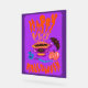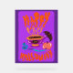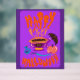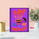 Ilustracion original de la taza de café de una bruja amante del gato de Halloween, varita mágica, poción, pequeños y lindos fantasmas, calabaza y murciélago volador con letras a mano diciendo Feliz Halloween. En colores vivos modernos y llamativos con ilustracion violeta y naranja para los niños.