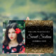 Crea tu propia fiesta de cumpleaños número 16 bienvenida 24x36 señal de acrílico grande para tu hija. Reemplace la imagen de ejemplo con su propia foto familiar. Personalizar la moderna y elegante caligrafía con un moderno estilo de letra todo tipo de mayúsculas para crear tu propio signo personalizado. El fondo presenta un falso purpurina dorado brillante sobre un sólido gráfico de arte digital de fondo negro. El purpurina brillante se crea con gráficos digitales que se imprimen como una foto en tu cartel.