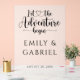 "Que comience la aventura", signo personalizado boda acrílico translúcido, con un corazón uniendo las cartas. Elegante caligrafía.