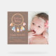 Un rayo de soñador bohemio tribal con abalorios y plumas en colores pastel. La tarjeta de anuncio de nacimiento neutra de género se puede usar para un niño o un chica. Personalizar con la foto e información de su bebé.