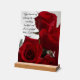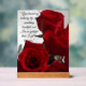 An elegant acrylic sign featuring a stunning close-up of deep red roses with delicate water droplets. The design is complemented by a beautiful and heartfelt quote: