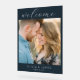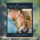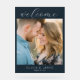 This wedding sign features a warm, intimate photograph of two individuals with their foreheads touching, framed by a dark navy border. The design includes elegant script and serif typography for a classic look, with customizable text options for names and dates. The color palette is dominated by soft golden tones from the natural lighting, complemented by denim blue and floral patterns in muted colors. Perfect for creating a welcoming atmosphere at weddings, this sign captures a genuine moment of affection and connection, making it both visually appealing and emotionally resonant.