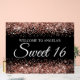 Crea tu propio símbolo de acrílico de bienvenida Sweet 16 - 16 cumpleaños para tu amigo. Personalizar la moderna y elegante caligrafía con un moderno estilo de mayúsculas en negro para crear tu propio signo personalizado. El brillante purpurina de oro rosa contra el negro se crea con gráficos digitales que se imprimen como una foto en tu cartel.