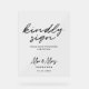 Un simple fondo blanco minimalista y un texto de escritura negro "firmar amablemente" el signo de la tabla boda para animar a su invitado a firmar su libro de bodas.