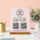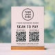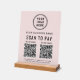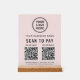 Create a polished, modern checkout experience with this elegant light pink Scan to Pay acrylic tabletop sign. Designed with an acrylic panel and solid wooden base, this sign adds a professional, upscale look to countertops, reception desks, and checkout stations while making it easy for customers to pay instantly. The clean layout showcases your logo and business name at the top, followed by a clear scan to pay call-to-action and 2 QR codes for popular payment apps. Add your address, phone number, website or other text to keep your business information visible and accessible. Ideal for boutiques, salons, spas, pop-ups, studios, and service-based businesses, this sturdy acrylic sign is both functional and stylish. It encourages fast, contactless payments while reinforcing your brand’s professionalism and attention to detail.