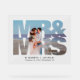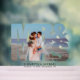 Moda un signo acrílico claro para conmemorar a su boda o aniversario con su foto en un marco "Mr & Mrs." recortado y sus nombres, fecha de boda y ubicación en una simple tipografía moderna.