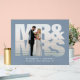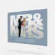 Moda polvorienta señal acrílica azul para conmemorar a su boda o aniversario con su foto recién casada en un marco "Mr & Mrs." cortado y sus nombres, fecha de boda y ubicación en una simple tipografía blanca moderna.