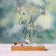 El signo acrílico claro de las Tarjetas y Regalos incluye flores silvestres delgadas, perfectas para la ducha de bebé. CAMBIAR EL TAMAÑO para que se ajuste a su evento y pedido con o sin un soporte de madera. COINCIDIENDO elementos de nuestra colección.