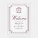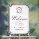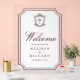 Elegant catholic wedding welcome sign featuring beautiful victorian crest with intricate details.