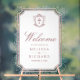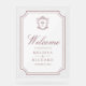 Elegant catholic wedding welcome sign featuring beautiful victorian crest with intricate details.