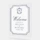 Elegant catholic wedding welcome sign featuring beautiful victorian crest with intricate details.