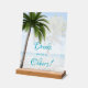 Opaque acrylic bar sign for a tropical themed wedding reception. Palm tree design with ocean beach background image. Aqua blue text is, "Drinks are on us. Cheers!"
