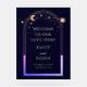 Welcome To Our Love Story Navy Blue Celestial Wedding Welcome Sign Celestial Cosmic Galaxy Space Acrylic Wedding Welcome Sign features a rainbow sun, moon and stars frame on a dark navy blue background. Inside the frame features the text "Welcome to our love story" with your names, wedding date and location in elegant peach calligraphy script. Designed for you by ©2024 Evco Studio www.zazzle.com/store/evcostudio