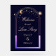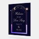 Welcome To Our Love Story Navy Blue Celestial Wedding Welcome Sign Celestial Cosmic Galaxy Space Acrylic Wedding Welcome Sign features a rainbow sun, moon and stars frame on a dark navy blue background. Inside the frame features the text "Welcome to our love story" with your names below in elegant peach calligraphy script. Designed for you by ©2024 Evco Studio www.zazzle.com/store/evcostudio