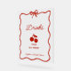 Add a playful and stylish touch to your bridal shower drinks table with this “She’s the Cherry on Top” sign. Featuring bold red script in a whimsical, retro-inspired font, the layout is accented by a sweet pair of hand-drawn cherries and a small bow for extra charm. Set on a crisp white background, the design is clean, airy, and easy to read across the table. Perfect for labeling cocktails, mocktails, or other beverages, it can also be personalized with the bride’s name, event date, or a short message. This cheerful, cherry-themed sign ties seamlessly into the “She’s the Cherry on Top” collection, adding a fun and coordinated finishing touch to your celebration.