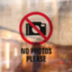 señal adhesiva transparente para ventana sin fotos permitidas (no es una pegatina). Señales de advertencia personalizadas para tiendas, museos, negocios, oficinas, lugares de trabajo, escuelas, hospitales y otros lugares. Crea tu propia señalización prohibida con círculo rojo y símbolo de cruz. No adhesivo. Se pega a la ventana. Práctico para instruir a clientes, visitantes, invitados, niños, etc.