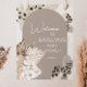 Hermosa señal de bienvenida con estampado de leopardo moderno para baby shower o bridal shower con acentos florales blancos y hojas tropicales. Cuenta con un diseño de arco moderno y elementos tropicales.