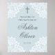Un elegante cartel de bienvenida para un bautismo de niños con esquinas blancas de encaje vintage y un delicado fondo azul cielo.