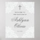Un elegante cartel de bienvenida para un bautismo de bebé o de bebé de niños con esquinas blancas de encaje vintage y un delicado fondo gris.