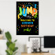 Bienvenido a sus huéspedes con energía y emoción usando este vibrante Jump Birthday Party Welcome Sign! Con colores llamativos, siluetas juguetonas, acentos purpurinas y un diseño dinámico, este cartel marca el tono para una celebración llena de diversión.