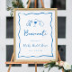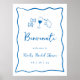 Este bonito diseño italiano de ducha de matrimonio presenta letras cursivas de estilo manuscrito acentuadas con un borde de cinta de garrapata ondulada en azul soleado. Ilustraciones dibujados a mano de pasta con corbata de arco, vino y un limón siciliano completan el diseño de la Costa Amalfitana de verano. Este elegante cartel mediterráneo de bienvenida a la ducha de novias incluye cuatro campos de texto personalizados, mostrados con "Benvenuti" (italiano de bienvenida) con su nombre y fecha de evento.