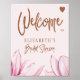Un moderno y glamuroso resorte o ducha de novias de verano poster de señas de bienvenida con pétalos de flores de magnolia pastel de color agua y un original guión de caligrafía de purpurina de cobre de estilo planchado a mano sobre un fondo rosa y lujoso. ++++++++++ Fácil de personalizar con el nombre de la novia! ++++++++ Ideal para fiestas de boda elegantes y modernos, con cristal floral, jardín al aire libre o patio trasero.