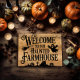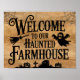 Un temible Bienvenido a nuestro haunted Farmhouse sign con cementerio, telaraña, fantasma y siluetas de escobas contra un fondo de madera descolorida