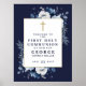 Este elegante cartel de bienvenida color azul marino floral de la primera comunión sagrada se puede personalizar con su información en la tipografía moderna. Diseñado por Thisisnotme©