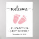 Poster de señas de bienvenida para la ducha de su bebé con "bienvenida" en un guión de bonito con toallitas y una acuarela rosa pastel con pies de bebé. Fácilmente personalizable con el nombre y la fecha de ducha de la futura madre.