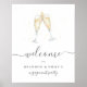 El elegante y festivo signo de bienvenida para su fiesta de compromiso o boda cuenta con un par de copas de champán en acuarela, llenas de burbujas. Personaliza con tres líneas de texto personalizado debajo; se muestra con "bienvenido" y los nombres de la pareja y el tipo de evento.