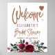 Moderna ducha de novia glamorosa de invierno bienvenida poster de señas de bienvenida con vino tinto oscuro borgoñas y peonías blancas con follaje verde, un corazón, y un elegante guión de caligrafía de purpurina de cobre escrito a mano sobre un fondo blanco. ++++++++++ Fácil de personalizar con el nombre de la novia, la fecha y el lugar! +++++++++ Adecuado para las modernas fiestas de novias florales, invernales y Navidades.
