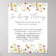 Hermosas flores silvestres y mariposas acentúan la parte superior e inferior de esta señal de boda. "En memoria amorosa" está impreso en negrita en una elegante letra cursiva. Las parejas pueden agregar sus propias palabras o usar lo que está impreso para crear un memorial para seres queridos fallecidos en su boda. Se pueden agregar nombres y su relación con la novia y el novio en la parte inferior.