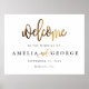 Este es un hermoso retrato poster cartel de bienvenida boda con texto de guión en oro
