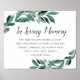 Diseñado para coincidir con nuestra colección de boda de follaje abundante, esta elegante señal botánica es perfecta para colocar en una mesa de memorial o exhibición en honor a los seres queridos que han fallecido. Personalice el encabezado y el texto del cuerpo (mostrado con "En amorosa memoria" y un breve poema) enmarcado por exuberante vegetación de acuarela y hojas de eucalipto.