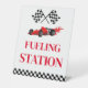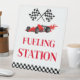 Señal para la fiesta de cumpleaños número dos de un niño con un motivo de coche de carreras y una representación de un automóvil azul con llamas. "estación de servicio," según el párrafo.