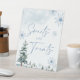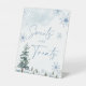 Señal de dulces y golosinas. Señal de baby shower y despedida de soltera de invierno con temática de bosque de invierno azul, con árboles de pino y copos de nieve.