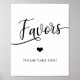 Diseño simplemente elegante en letras de topografía de escritura negra y fondo blanco y letras negras. Pequeño corazón en el medio. Señal de FAVORES de boda o despedida de soltera para cualquier época del año o tema. Coloque la señal en la mesa donde los recuerdos para invitados puedan tomar uno en la entrada o cuando se vayan