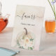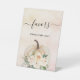 Un fondo degradado de color rosa sonrosado y dorado rosa, una calabaza de color crema y flores. Texto: Favores, por favor tome uno.