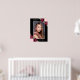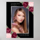 Elegante señal de bienvenida de celebración de vida/funeral con acuarela negra y plateada con marco de foto plateado adornado con rosas rojas burdeos y rosadas y flores de aliento de bebé. Artículos coincidentes disponibles.