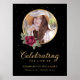 Elegante señal de bienvenida de funeral floral de oro, burdeos y negro con un marco de foto dorado adornado con rosas rojas de burdeos.