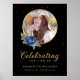 Elegante señal de bienvenida de funeral floral dorado y azul negro con un marco de foto dorado adornado con rosas azules sobre un fondo negro. El fondo se puede cambiar a cualquier color.