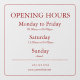 Haga que sus horas de negocio sean claras y elegantes con esta calcomanía para ventana personalizable. Perfecta para puertas y ventanas de tiendas, esta calcomanía reutilizable muestra sus horas de apertura con un diseño limpio y profesional que llama la atención. Fácil de aplicar y quitar sin residuos, ideal para tiendas, cafeterías, salones y oficinas.