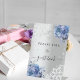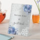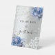 Un fondo con apariencia de plata falsa. Decorado con rosas azules, flores, encaje blanco y algunos diamantes. Con el texto: Por favor firme el libro de invitados.