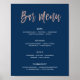 LEAH • Esta señal de menú de bar de azul marino y dorado rosa es perfecta para bodas románticas y elegantes. La pasión es aportada por la fuente de letra manuscrita en textura de lámina de “falso” dorado rosa mientras que el fondo azul marino estilizado combinado con el texto blanco añade un toque de preciosidad. Esta colección coordina bien con celebraciones glamurosas especialmente para eventos interiores, de otoño o invierno.