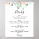 Esta señal de menú de bebidas de boda de eucalipto contemporáneo es perfecta para una boda simple. El diseño presenta peonías delicadas de color púrpura, rubor, burdeos y burgundy en acuarela con hojas de eucalipto verdes, inspirando belleza artística.