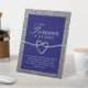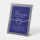 Elegante y simple señal de pedestal de mesa conmemorativo de boda de brillo plateado y azul real con corazón de cuerda romántico y letra de caligrafía moderna.