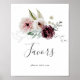 Esta señal de libro de invitados de romance floral es perfecta para una boda elegante. El diseño boho rústico moderno cuenta con flores románticas de acuarela en tonos suaves de burgundy, malva, rosa y blanco crema con hojas verdes.